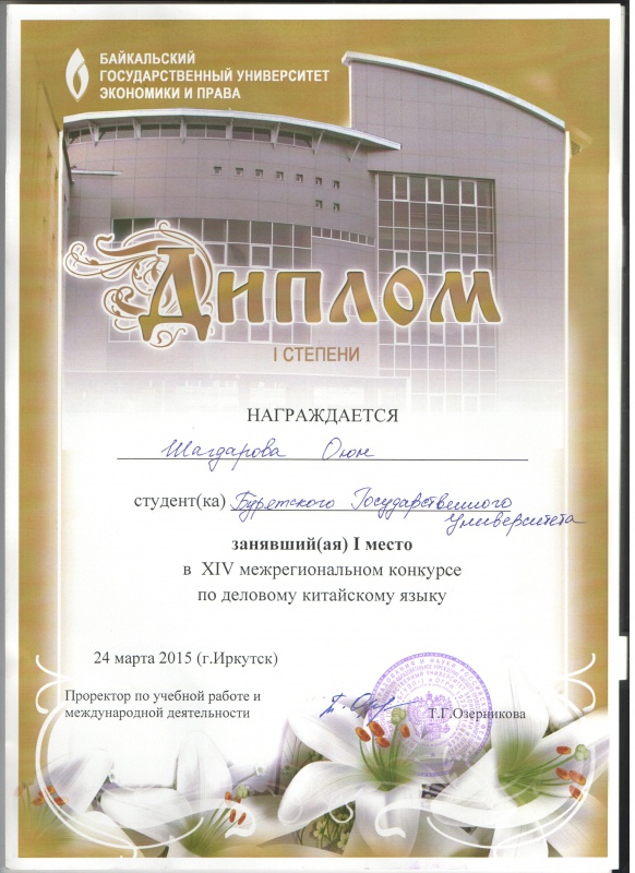Дирекция Восточного института, кафедра филологии стран Дальнего Востока поздравляет студентку IV курса Восточного института Шагдарову Оюн Арслановну, занявшую I место в XIV межрегиональном конкурсе по китайскому языку.