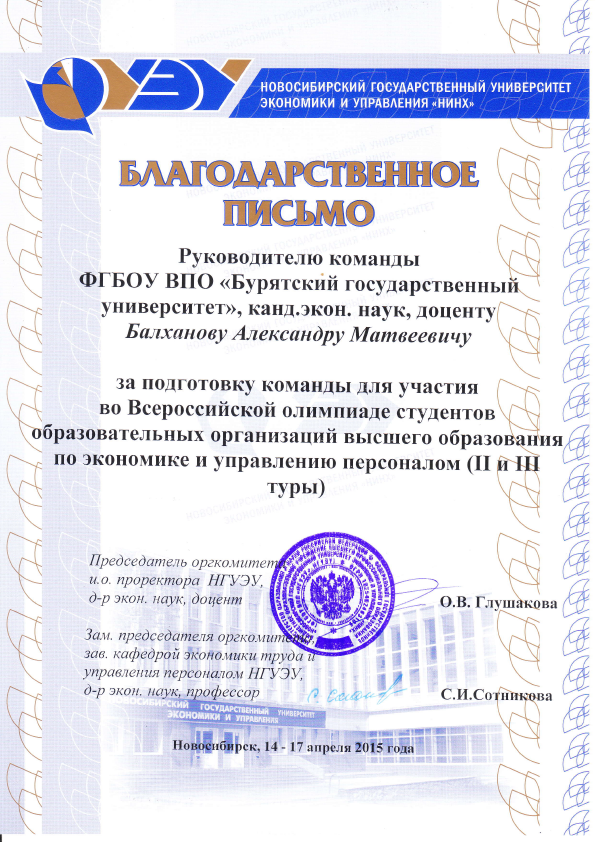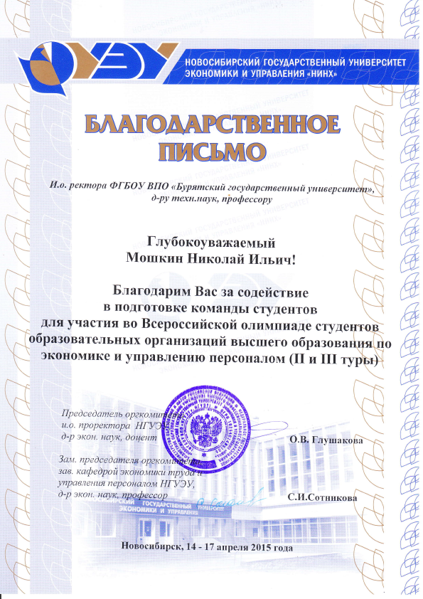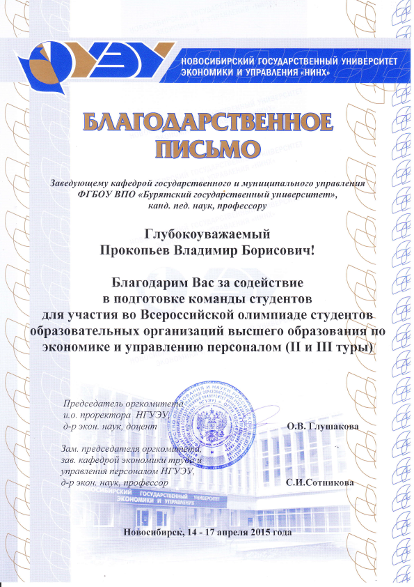 Оргкомитет Всероссийской олимпиады по управлению персоналом Сибирского кадрового форума выразил благодарность за содействие в подготовке команды студентов и.о. ректора Бурятского государственного университета Н.И. Мошкину и заведующему кафедрой государственного и муниципального управления В.Б. Прокопьеву, а руководителя команды поблагодарил за подготовку команды для участия.