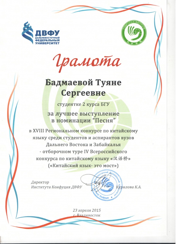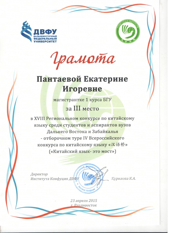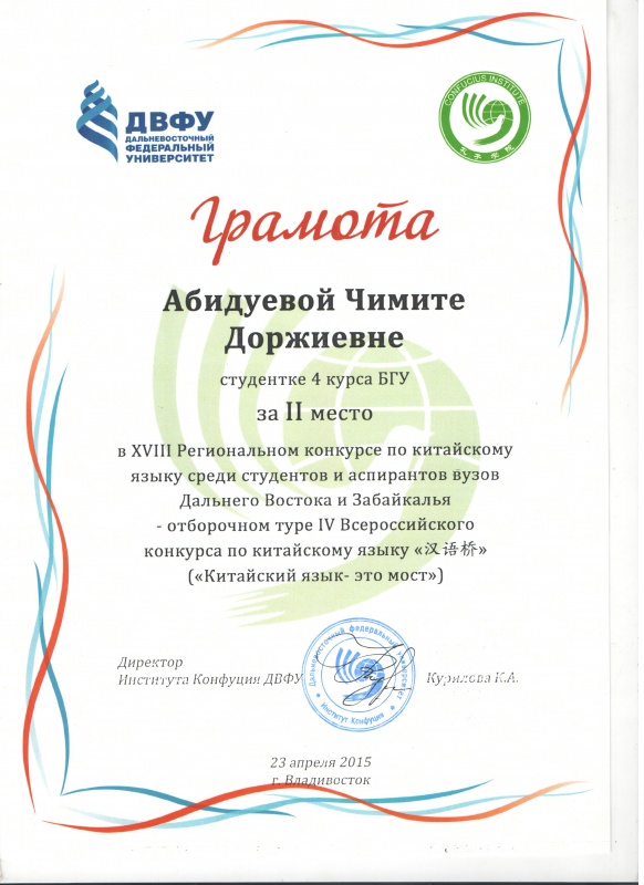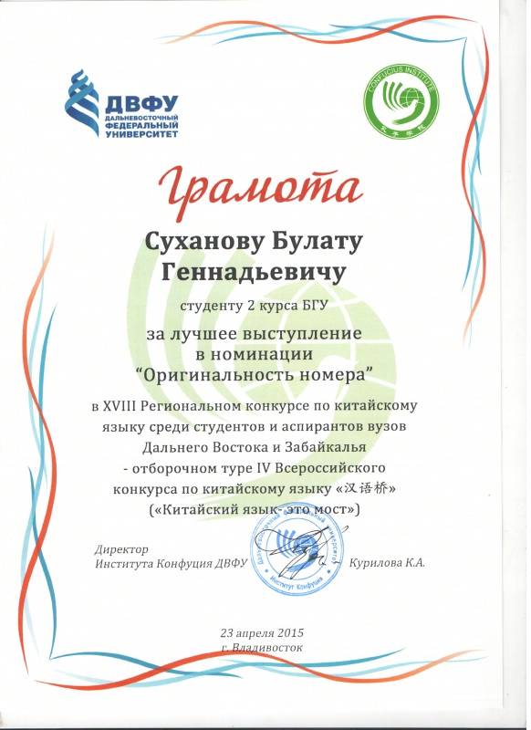 23 апреля 2015 года в Дальневосточном федеральном университете состоялся XVIII-ый Региональный конкурс по китайскому языку среди студентов, магистрантов и аспирантов вузов Дальнего Востока И Забайкалья - отборочного тура IV-го Всероссийского конкурса по китайскому языку "Китайский язык - это мост". В данном конкурсе приняли участие 22 студента и магистранта из семи вузов: Бурятский государственный университет (г. Улан-Удэ), Дальневосточный Федеральный университет (г. Владивосток), Забайкальский государственный университет (г. Чита), Амурский государственный университет (г. Благовещенск), Камчатский государственный университет им. Витуса Беринга (г. Петропавловск-Камчатский), Сахалинский государственный университет (г. Южно-Сахалинск), Уссурийский государственный педагогический институт (г. Уссурийск).