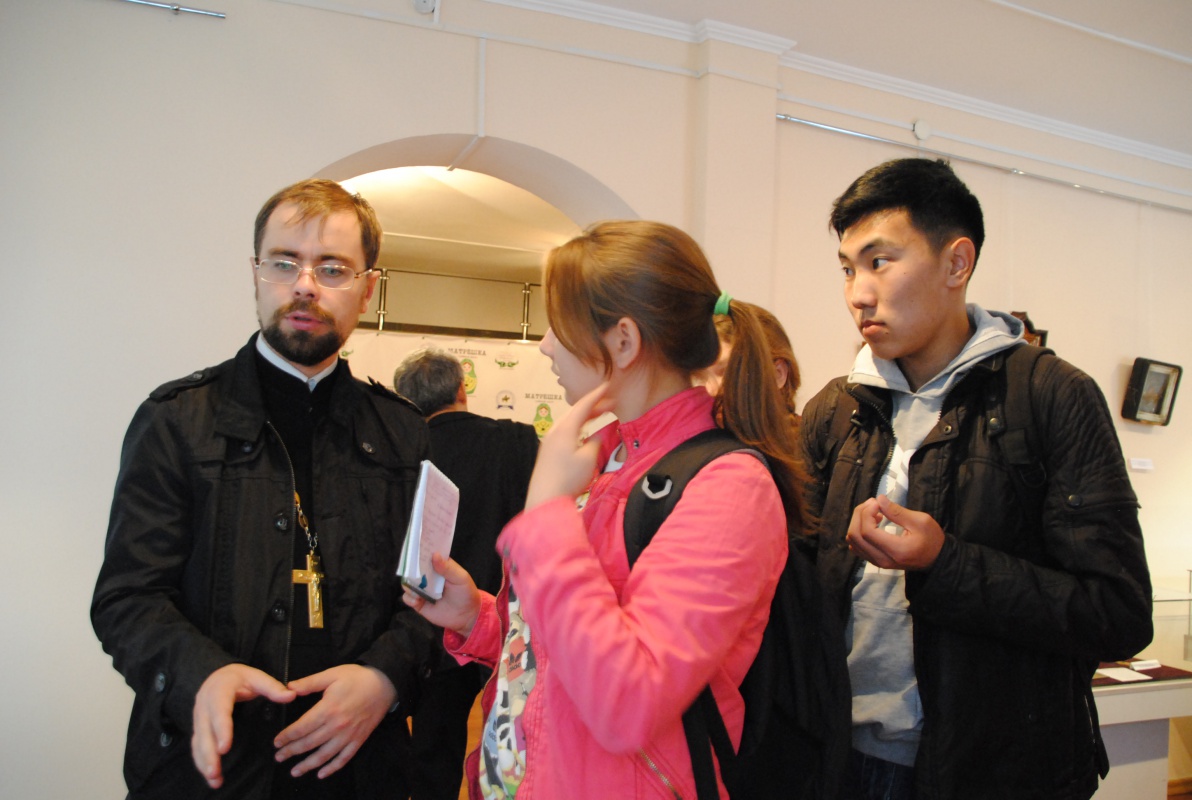 Студенты исторического факультета на экскурсии в музее на выставке "Свет православной культуры" из фондов Кяхтинского краеведческого музея в г.Улан-Удэ.
