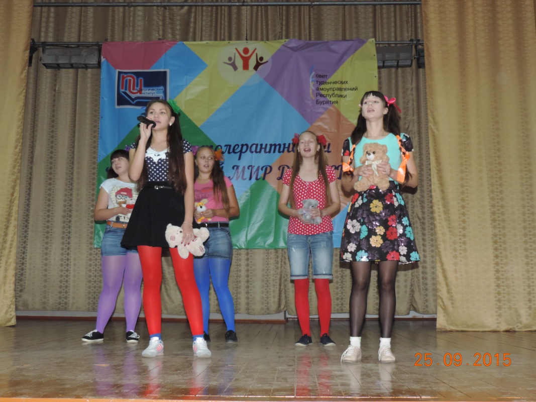 Фестиваль "Сказочный мир дружбы" прошел 25 сентября в Педагогическом институте в рамках реализации республиканского гранта, выигранного студентами ПИ в июне 2015 г. Программа праздника включала в себя концертную программу, в которой звучали музыка, стихи и песни народов, населяющих нашу необъятную страну. В рамках праздника студенты старших курсов организовали толерантное посвящение первокурсников в студенты. Кульминацией праздника были народные игры (армянские, тувинские, якутские, бурятские и русские), в которых многие студенты неплохо себя проявили. Праздник прошёл в тёплой дружеской обстановке.