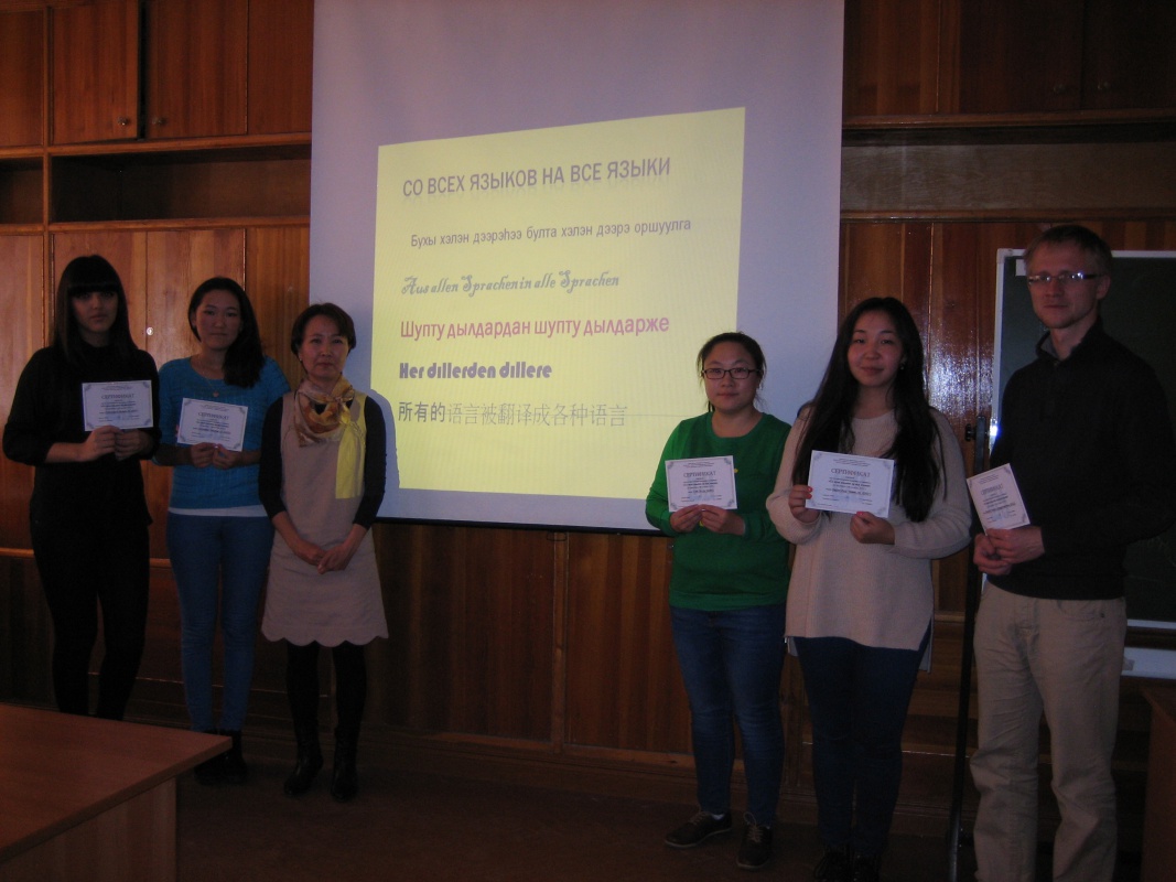 C 22 сентября по 6 октября в стенах ИФМК звучали «все языки», в эти дни был проведен ряд семинаров под руководством доцента кафедры Самбуевой В.Б. по реле-переводу «Со всех языков на все языки», на котором участники переводили стихи с чужих языков на свои родные языки (бурятский, тувинский, китайский, азербайджанский, немецкий) через язык-посредник (русский) по методике профессора Майнцского Университета А. Ф. Келлетата (Германия). Все участники семинара отметили, что это был очень полезный и интересный опыт, который показал, что любое стихотворение на любом языке действительно можно перевести на все языки мира, владея при этом только реле-языком, который выступает как посредник не только между различными языками, но и культурами.