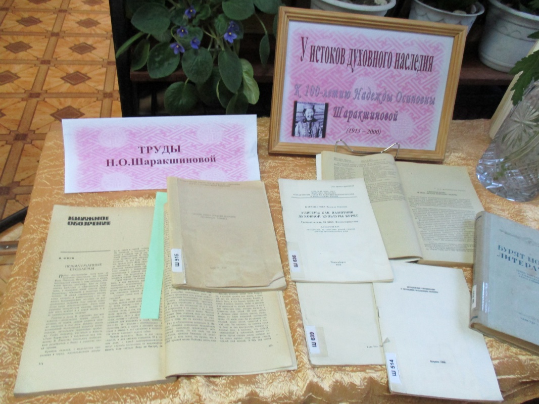 Имя Н.О. Шаракшиновой – первой женщины бурятки кандидата и доктора филологических наук, крупнейшего ученого-монголоведа, фольклориста, профессора Иркутского государственного университета, широко известно не только в нашей стране, но и за рубежом. Н.О. Шаракшинова является автором более 10 монографий, учебников, свыше 150 научных статей, ею собраны и записаны уникальные памятники бурятского фольклора из уст самих сказителей. Проф. Н.О. Шаракшинова проработала в ИГУ более пятидесяти лет, воспитала много учеников, которые и сегодня продолжают ее дело.