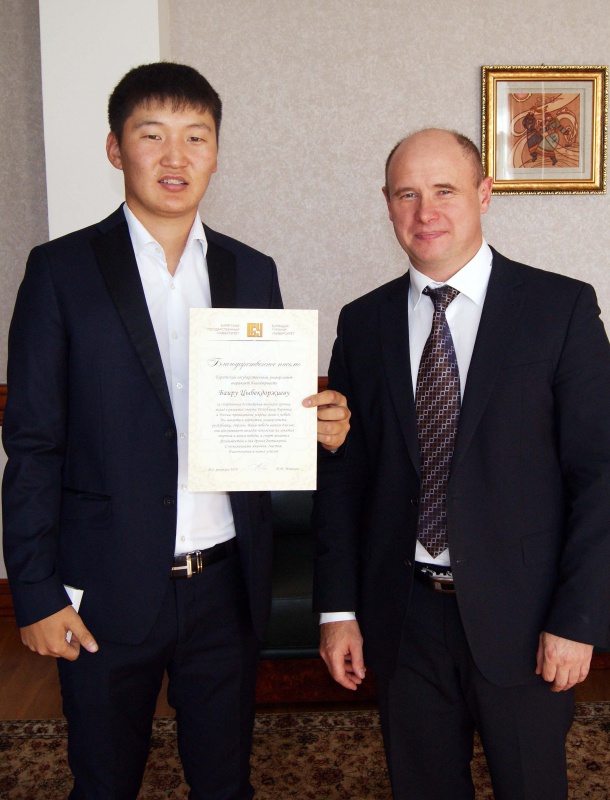 После этого Николай Мошкин пообещал всяческую поддержку и содействие не только присутствующим ребятам, но и всем студентам нашего университета, которые занимаются спортом. Ректор отметил, что договоренность с директором департамента Министерства образования и науки РФ Александром Страдзе о строительстве нового спортивного сооружения БГУ, это лишь этап в развитии спортивной базы БГУ. По мнению ректора, спортивная база университета должна быть не только лучшей в регионе, но и в Сибири. Ведь у нас есть прекрасные спортивные традиции во многих видах спорта, но необходимо развивать и новые направления, Бурятия должна быть широко представлена на спортивном Олимпе нашей страны.