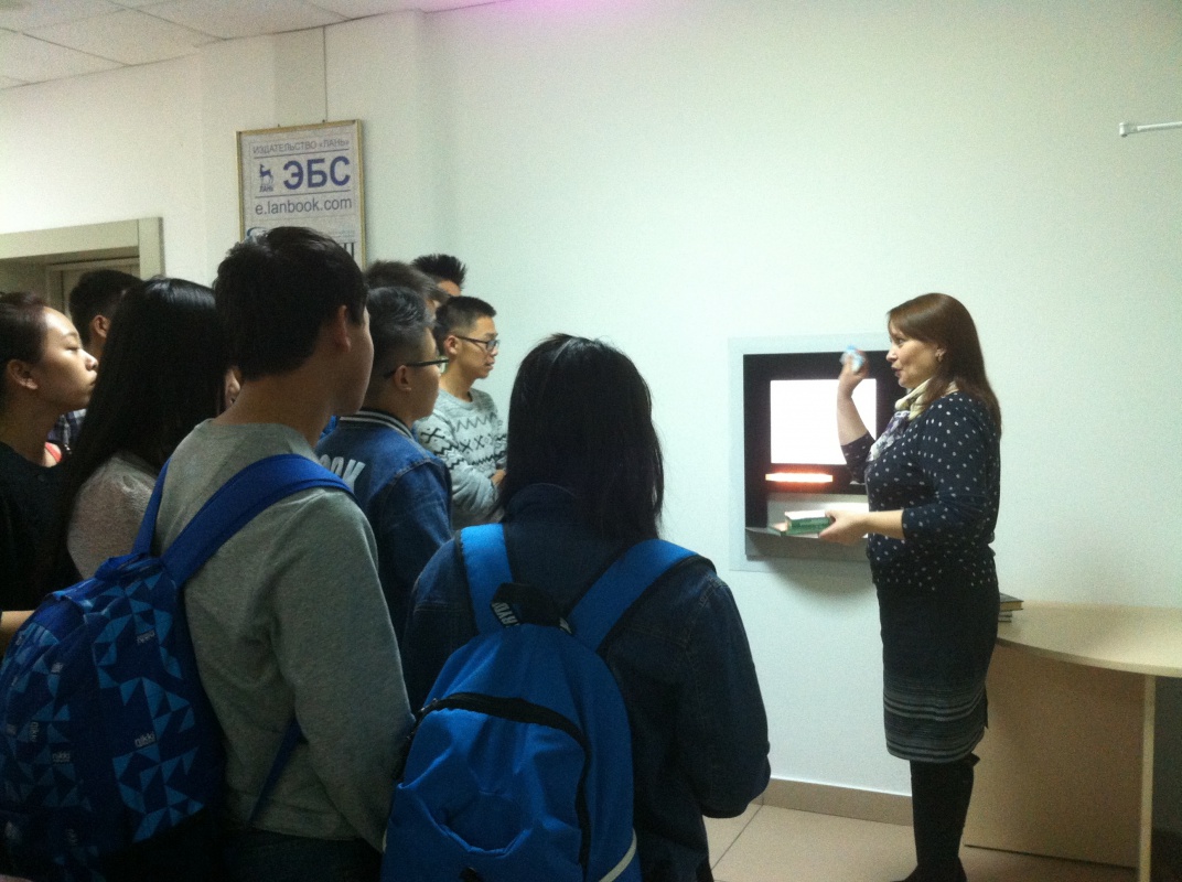 22 октября ознакомительную экскурсию по залам и отделам библиотеки провела Н.Л. Сарафанчук, зав. научно-методическим отделом. Наталья Леонидовна наглядно показала иностранным студентам, как пользоваться автоматической станцией возврата книг и станцией книговыдачи. Студенты впервые увидели настоящие раритеты Фонда редких и ценных изданий, древнейшие рукописи и книги. Особое впечатление на ребят произвел недавно открытый Зал корейской культуры, живой читательский интерес вызвали книги Фонда Института Конфуция. Студенты поблагодарили сотрудников НБ и высказали желание самостоятельно работать в залах библиотеки.