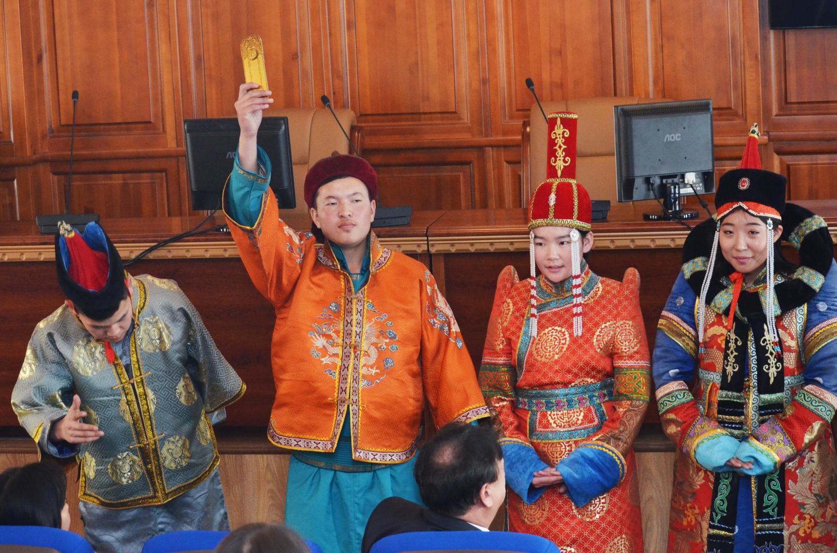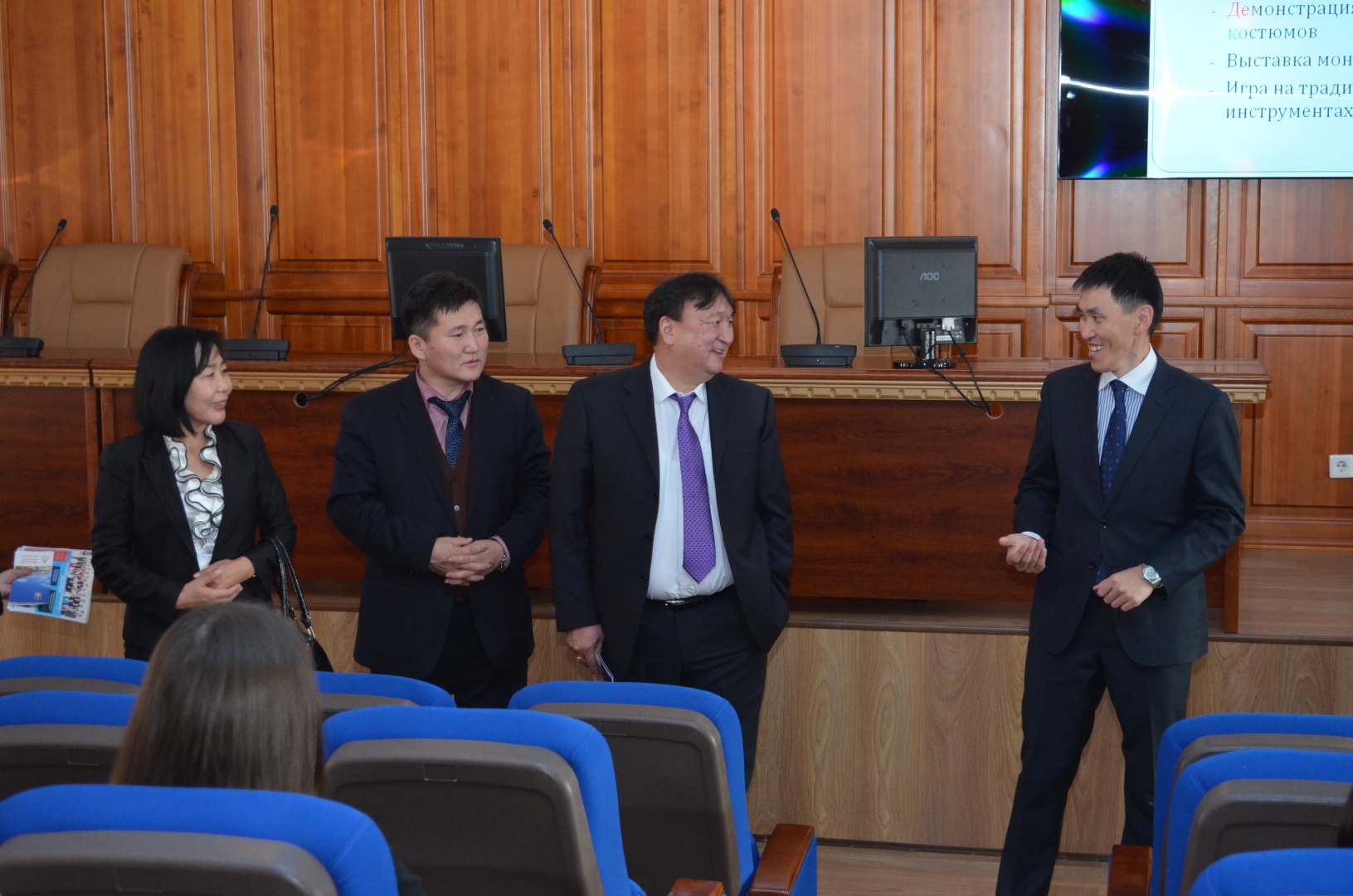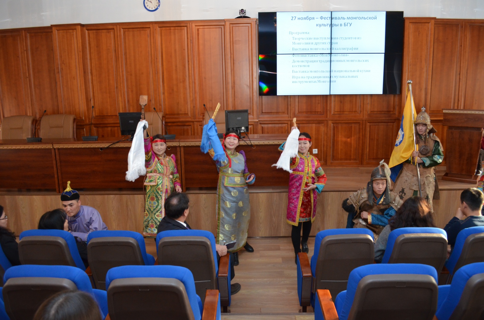 Прозвучала приветственная песня на монгольском языке, также ребята показали небольшое представление в национальных костюмах. Затем гости и хозяева обменялись памятными подарками. В дальнейшей программе пребывания делегации посещение социально-психологического факультета, института экономики и управления, экскурсия по Научной библиотеке.