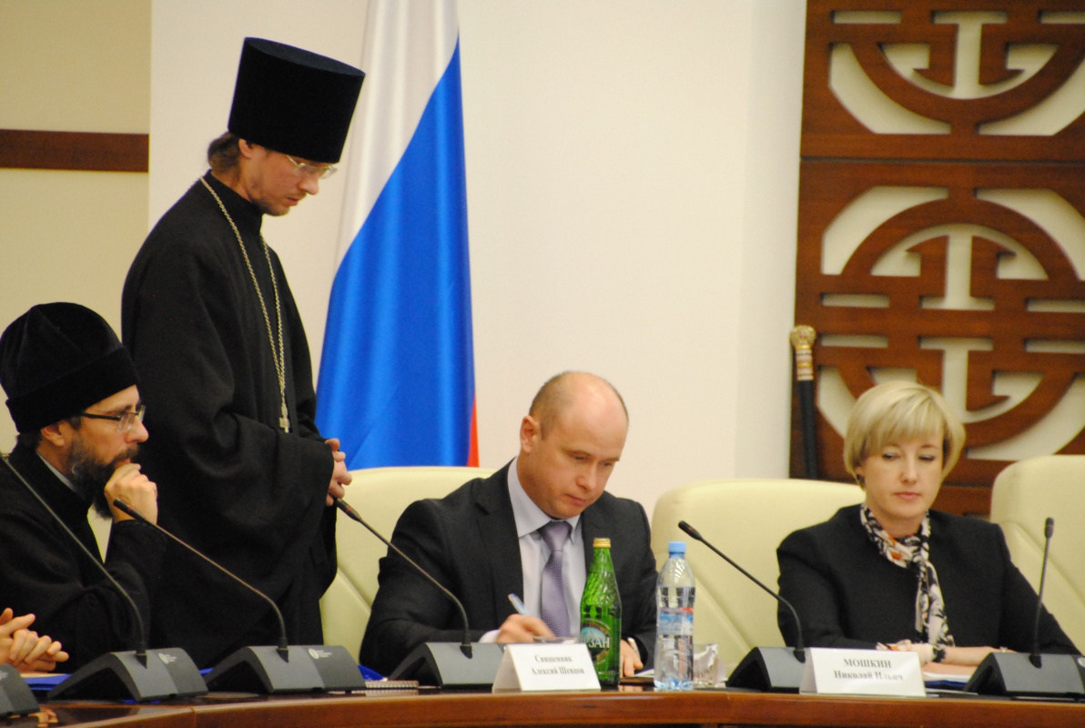 В своем выступлении Н. И. Мошкин поблагодарил Владыку лично и священнослужителей Улан-Удэнской и Бурятской митрополии - о. Алексея Шевцова, о. Георгия Кривосудова. о. Андрей Тарасова за активное участие в учебном процессе. Николай Ильич отметил важность межконфессионального мира во всех его проявлениях. В данном контексте он добавил, что в БГУ, в рамках учебных дисциплин на всех факультетах преподаются такие учебные курсы дисциплин, как история религии, религиоведение, религиозная философия, которые призваны изучению и сохранению столь хрупкого мира, как межконфессиональное согласие. Свое выступление Н.И. Мошкин закончил следующей фразой: "Пусть встреча представителей государственных, религиозных и общественных организаций, послужит делу сохранения стабильности в нашем обществе".