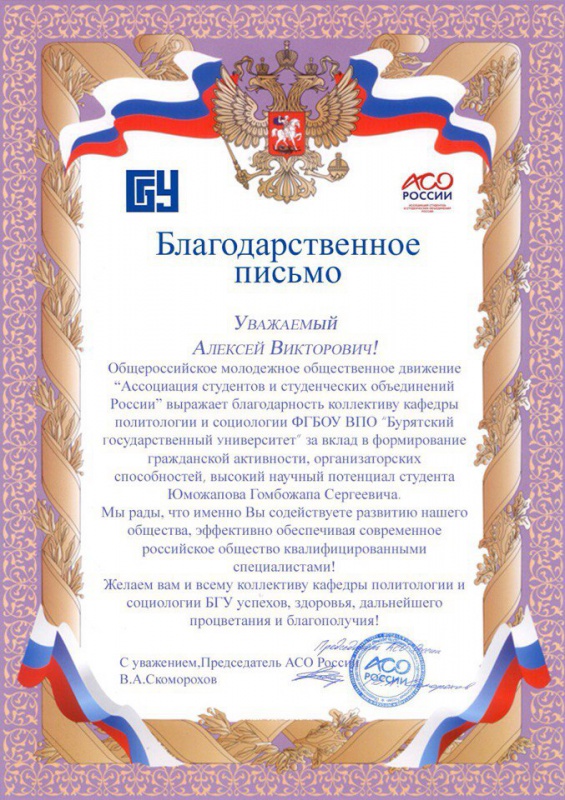 Студенты зарекомендовали себя как ответственные и исполнительные молодые специалисты, за что кафедра политологии и социологии в лице заведующего кафедрой Комбаева Алексея Викторовича была отмечена благодарственными письмами от руководства общественных организаций.