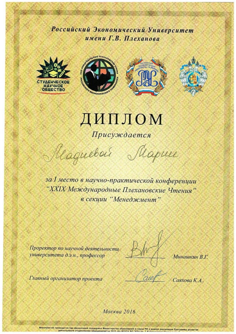 В Российском экономическом университете имени Г.В. Плеханова (г. Москва) с 24 по 26 февраля состоялся очный этап научной конференции «XXIX Международные Плехановские Чтения», в котором принимала участие студентка Института экономики и управления Мария Мадиева (научный руководитель Цыренов Д.Д.)