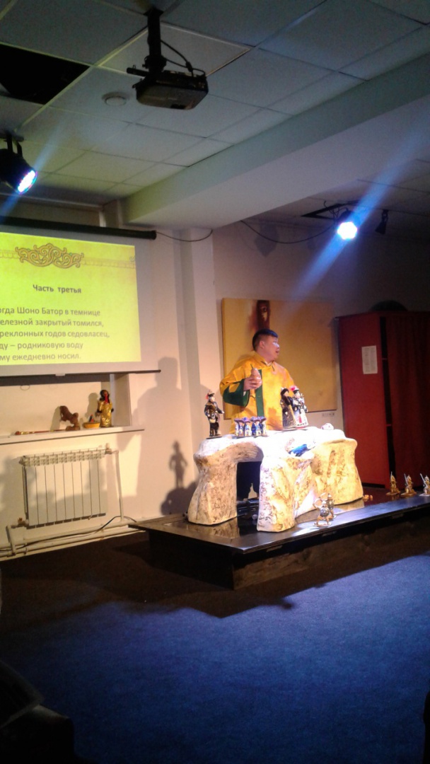 Студенты Восточного института посетили известный спектакль-инсталляцию «Шоно Баатар» в этно-галерее «Орда». Авторская интерпретация известного улигера носит камерный характер: в ней нет широких жестов и громоздких полотен, зато каждая деталь наделена смыслом, действующим лицом может стать незатейливая, на первый взгляд, вещица, а вся масштабность произведения заложена между строк и подвигает зрителя к серьезным размышлениям об истинных ценностях.
