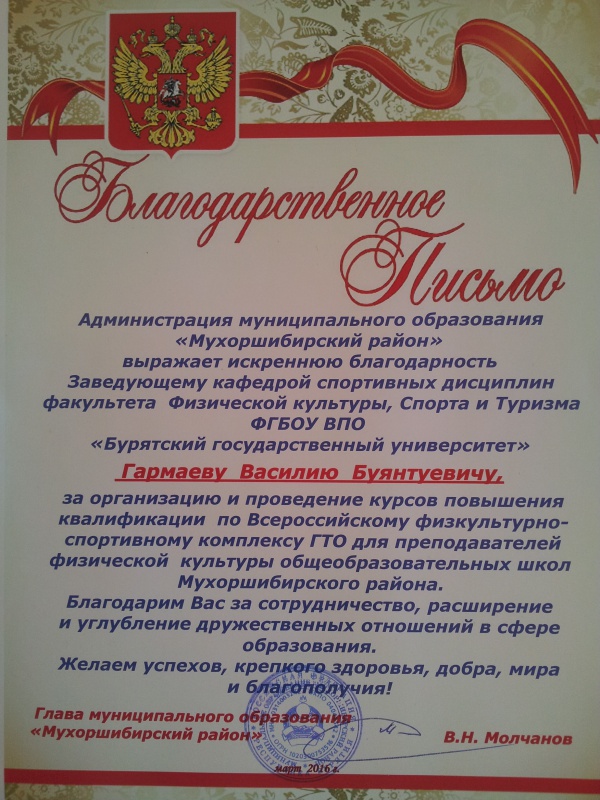 В конце курсов слушатели защитили разработанные ими проекты и сдали нормативы ГТО в своей возрастной ступени. 22 марта в Администрации Мухоршибирского района прошло собрание учителей и директоров школы по вопросам физического воспитания школьников, на котором официально вручены удостоверения 23 слушателям курсов. Администрация муниципального образования Мухоршибирского района вручили благодарственные письма и.о. ректора БГУ Николаю Ильичу Мошкину, заведующему кафедрой спортивных дисциплин БГУ Василию Буянтуевичу Гармаеву за организацию и высокий уровень в проведении курсов повышения квалификации.