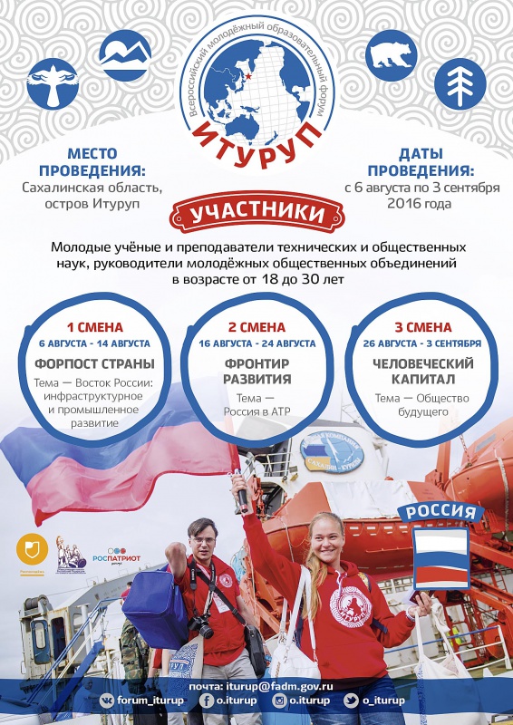 В период с 6 августа по 3 сентября в Сахалинской области пройдет форум «Итуруп»: Форум пройдет по 3 профильным сменам; «Форпост страны», «Фронтир развития» и «Человеческий капитал», с участием 300 молодых ученых, преподавателей технических и общественных наук, руководителей молодежных общественных объединений из всех регионов Российской Федерации.