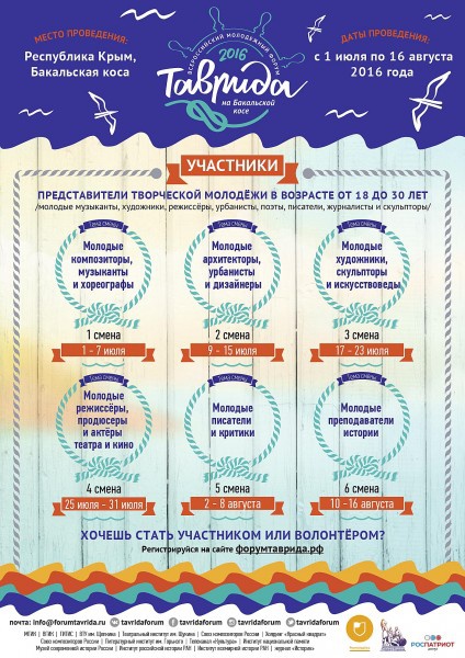 В период с 1 июля по 16 августа в Республике Крым состоится форум «Таврида» на Бакальской косе. Программа форума включает в себя 6 тематических смен: «Молодые композиторы, музыканты и хореографы», «Молодые архитекторы, урбанисты и дизайнеры», «Молодые художники, скульпторы и искусствоведы», «Молодые режиссеры, продюсеры и актеры театра и кино», «Молодые писатели, поэты и критики», «Молодые преподаватели истории». Участниками форума «Таврида» станут более 3 тысяч молодых преподавателей творческих профессий из всех регионов Российской Федерации и других стран.