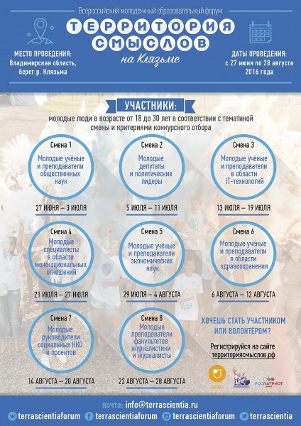 В период с 27 июня по 28 августа во Владимирской области состоится форум «Территория смыслов на Клязьме». Форум будет проведен по 8 тематическим сменам: «Молодые ученые и преподаватели общественных наук», «Молодые депутаты и политические лидеры», «Молодые ученые и преподаватели в области IT-технологий», «Молодые специалисты в области межнациональных отношений», «Молодые ученые и преподаватели экономических наук», «Молодые ученые и преподаватели в области здравоохранения». «Молодые руководители социальных НКО и проектов». «Молодые преподаватели факультетов журналистики, молодые журналисты». Ожидается участие не менее 8 тысяч человек из всех субъектов Российской Федерации и иностранных государств.