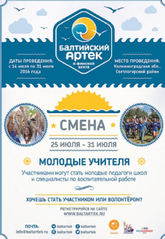 Кроме того в рамках форума «Балтийский Артек» в период с 25 по 31 июля в Калининградской области состоится всероссийская смена «Молодые учителя». Предполагается участие 350 молодых учителей и специалистов по воспитательной работе.