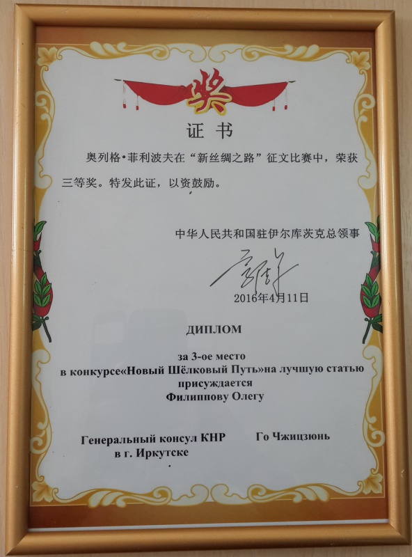 Студент 2 курса гр. 16441 Филиппов Олег, представивший на конкурс статью «新丝绸之路—俄罗斯的展望» («Новый шелковый путь – перспективы для России»), завоевал III место и награжден дипломом и денежным призом в размере 10000 рублей.