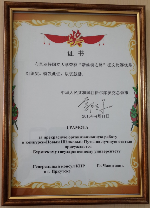 В марте 2016 г. Генеральным консульством КНР в г. Иркутск был проведен Конкурс на лучшую статью на китайском языке «Новый шелковый путь», в котором приняли участие десять студентов Восточного института БГУ.