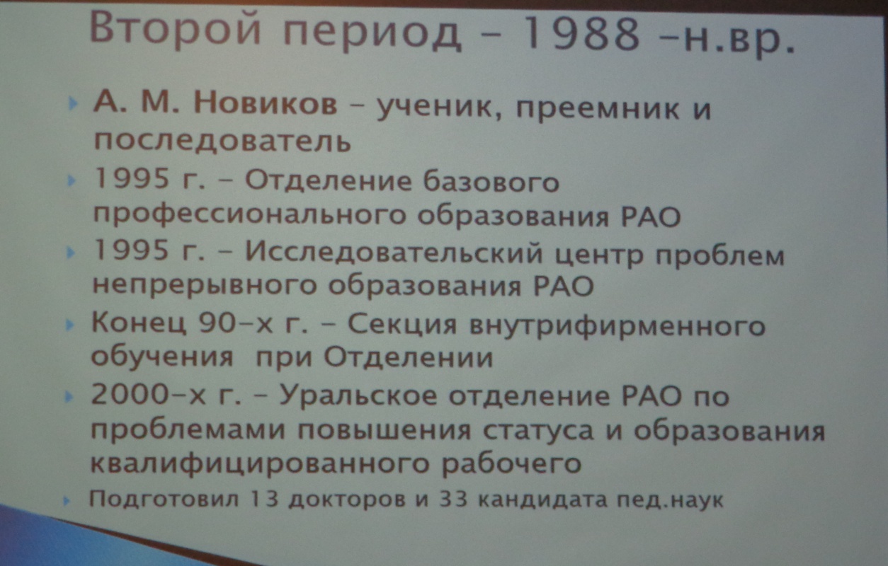 В представлении научной школы С.Я.Батышева-А.М.Новикова приняла участие профессор кафедры общей педагогики БГУ, ученица А.М.Новикова - Л.Н.Рулиене. Ученый совет ИСРО РАО принял решение о проведении международной конференции, посвященной 75-летию академика А.М.Новикова. Центральным событием конференции станет открытие филиала научной школы академика А.М.Новикова в Бурятии (на базе БГУ), поэтому 1-ый этап конференции (1-2 декабря с.г.) состоится в Улан-Удэ. В перерыве состоялась теплая беседа с Вульфсоном Б.Л., член-корр. РАО, д.п.н., проф., старейшим и широко известным специалистом в области сравнительной педагогики.