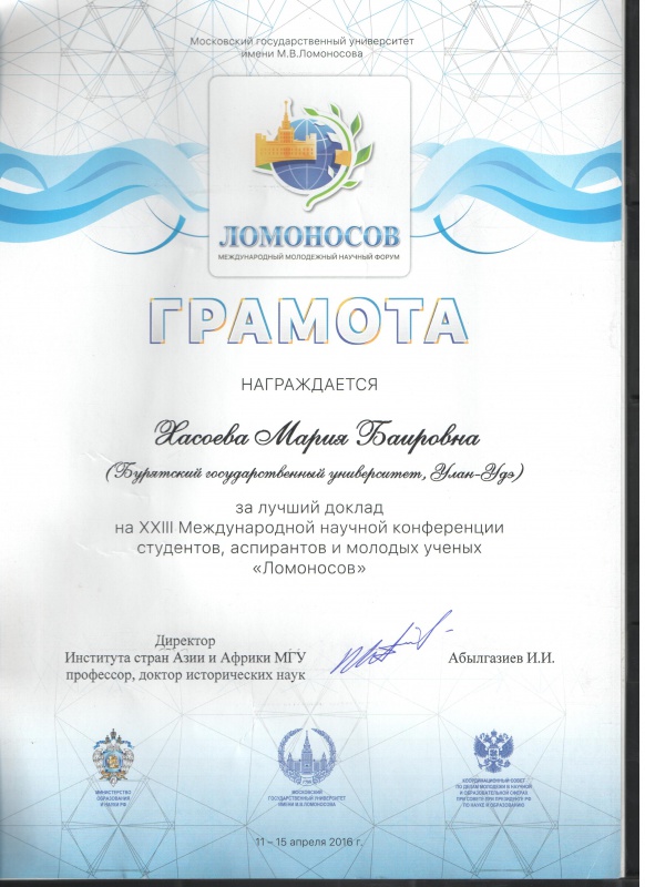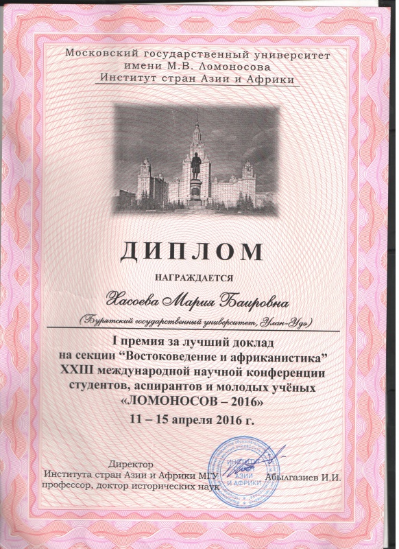 Восточный Институт поздравляет Хасоеву Марию Баировну, студентку 4 курса гр. 10424, получившую I премию за лучший доклад в секции «Востоковедение и африканистика» (научный руководитель ст. преп. каф. ФСДВ Аюшеева Н.Г.) и Филиппова Олега Сергеевича, студента 2 курса, гр. 16441 (научный руководитель к.ф.н., доц. каф. ФСДВ Тугулова О.Д.), получившего диплом III степени за доклад в секции «Востоковедение и африканистика» на XXIII международной конференции студентов, аспирантов и молодых ученых «ЛОМОНОСОВ - 2016», проходившей с 11 по 15 апреля 2016 г. в Институте стран Азии и Африки Московского государственного университета.