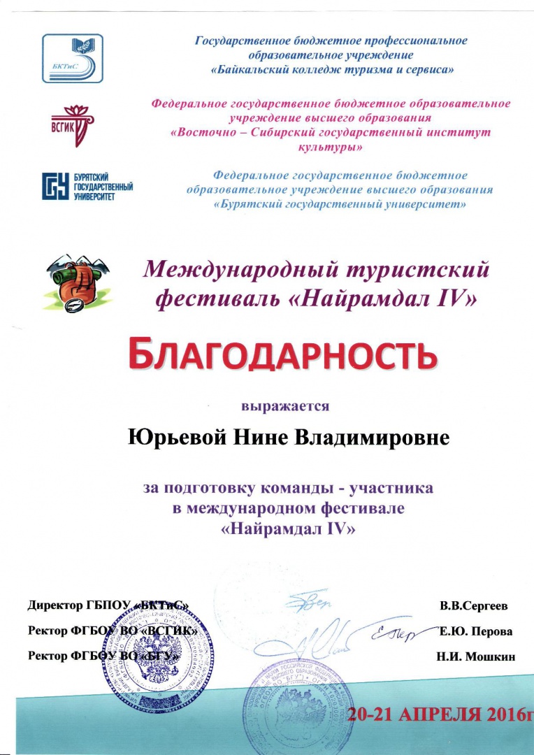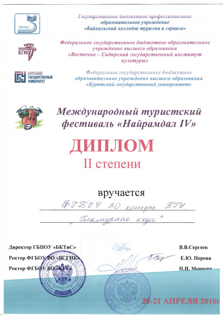 Дирекция Колледжа БГУ поздравляет студентов Колледжа специальности "Туризм"- Ламаеву Галину, Батоеву Намгар, Константинову Анну, Балданову Сэлмэг, Батоеву Намгар, Батуеву Арюна, Ершову Александру и научного руководителя ст. преподавателя кафедры сервиса и туризма Юрьеву Н.В. , занявших 2 место в Международном туристическом фестивале "Найрамдал IV". Желаем дальнейших успехов и побед!