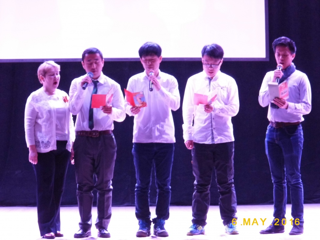 Иностранные студенты поздравили преподавателей и всех присутствовавших с праздником, выступив с песнями военных лет: "Катюша" (исполнялась на китайском, монгольском, корейском и русском языках), "День Победы" (солист Ким Донхен, Республика Корея), "Алеша" (под управлением преп. каф. РКИ Гурбановой Т.И.).
