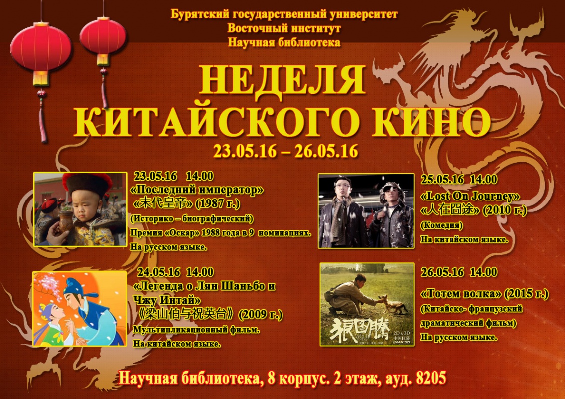В течение недели будет представлено 4 фильма, созданных в 1987-2015 годах современными китайскими режиссерами. Так все зрители могут увидеть знаменитую китайскую историко-биографическую картину «Последний император», которая получила премию «Оскар» в 1988 г. в 9 номинациях. Также в показ включены известные кинокартины, снятые в последние 3 года и мультипликационный фильм на китайском и русском языках. Вход на все показы свободный.