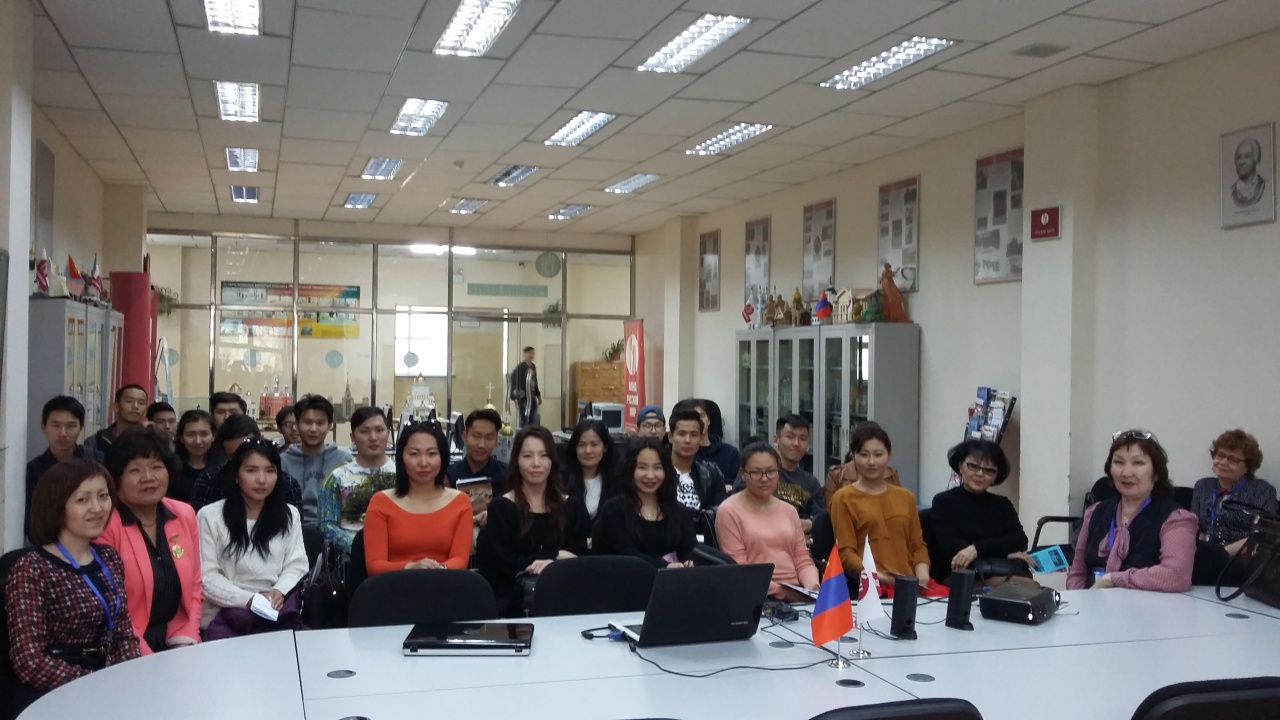 С 18.05.2016 г. по 21.05.2016 г. делегация БГУ в составе Егодуровой В.М. (ИФМК), Улазаевой Г.В. (ИФМК), Патаевой В.Д. (ВИ), Андреевой С.В. (ПИ) приняла участие в торжественных мероприятиях, посвященных Единому дню русского языка и 40-летию Российского центра науки и культуры (РЦНК) в г. Улан-Батор: в XIIмеждународной научно-практической конференции «Русский язык как иностранный в современном образовательном пространстве», котораяпроводилась Представительством Россотрудничества в Монголии, РЦНК, Монгольским государственным университетом, а также в информационно-рекламных мероприятиях с монгольскими учащимися. Монгольская ассоциация преподавателей русского языка и литературы вручила д.ф.н., профессору кафедры русского языка и общего языкознания ИФМК В.М. Егодуровой диплом Почетного доктора - за большой личный вклад в дело распространения и пропаганды русского языка в Монголии. Отметим, что БГУ имеет давнюю историю тесного сотрудничества с монгольскими университетами и РЦНК.