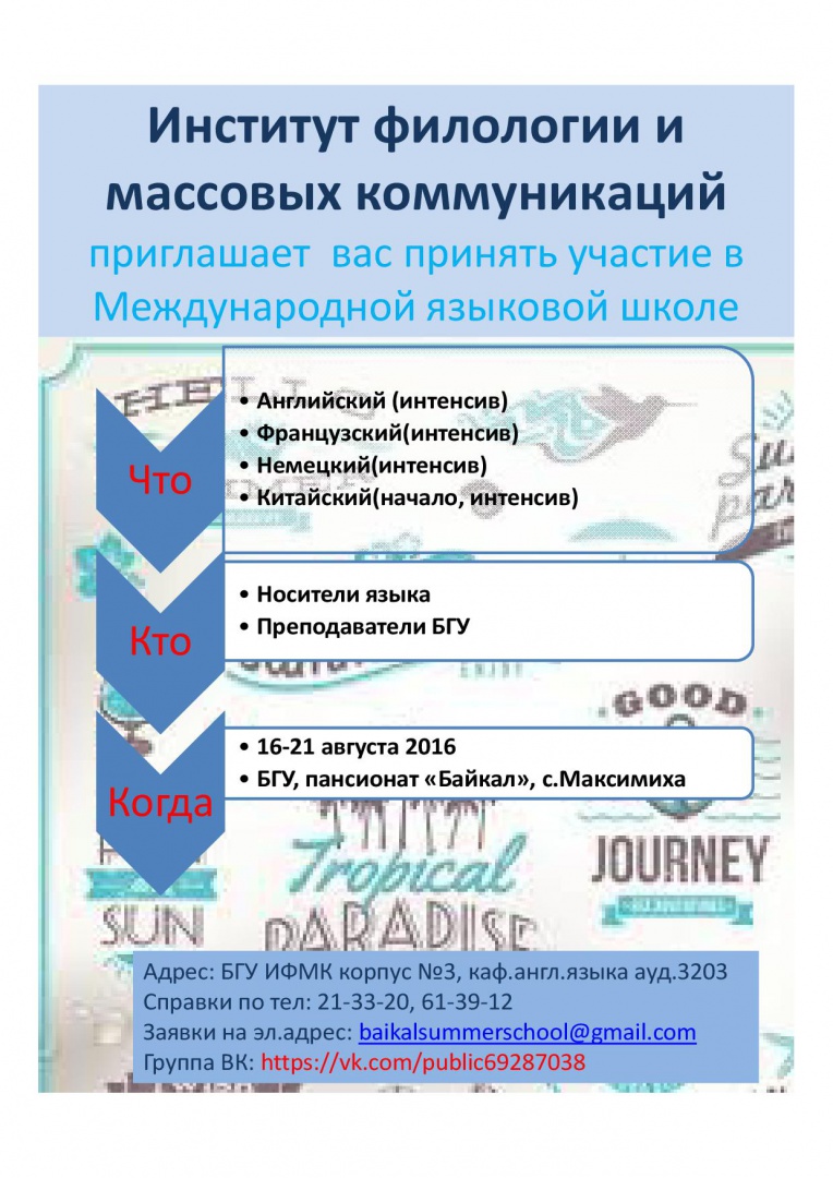 Институт филологии и массовых коммуникаций БГУ приглашает студентов и учащихся старших классов принять участие в Байкальской международной школе молодого филолога с 16 по 21 августа 2016 года в пансионате «Байкал» (пос. Максимиха).