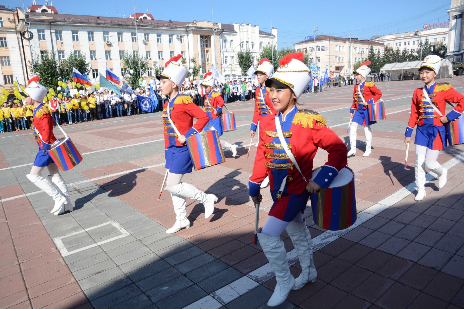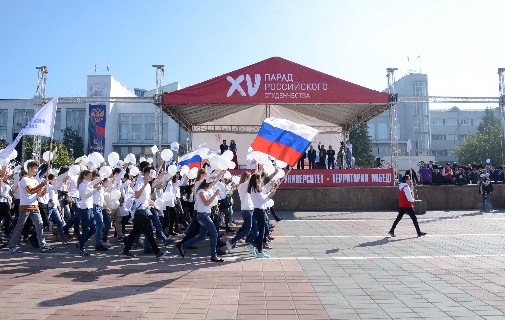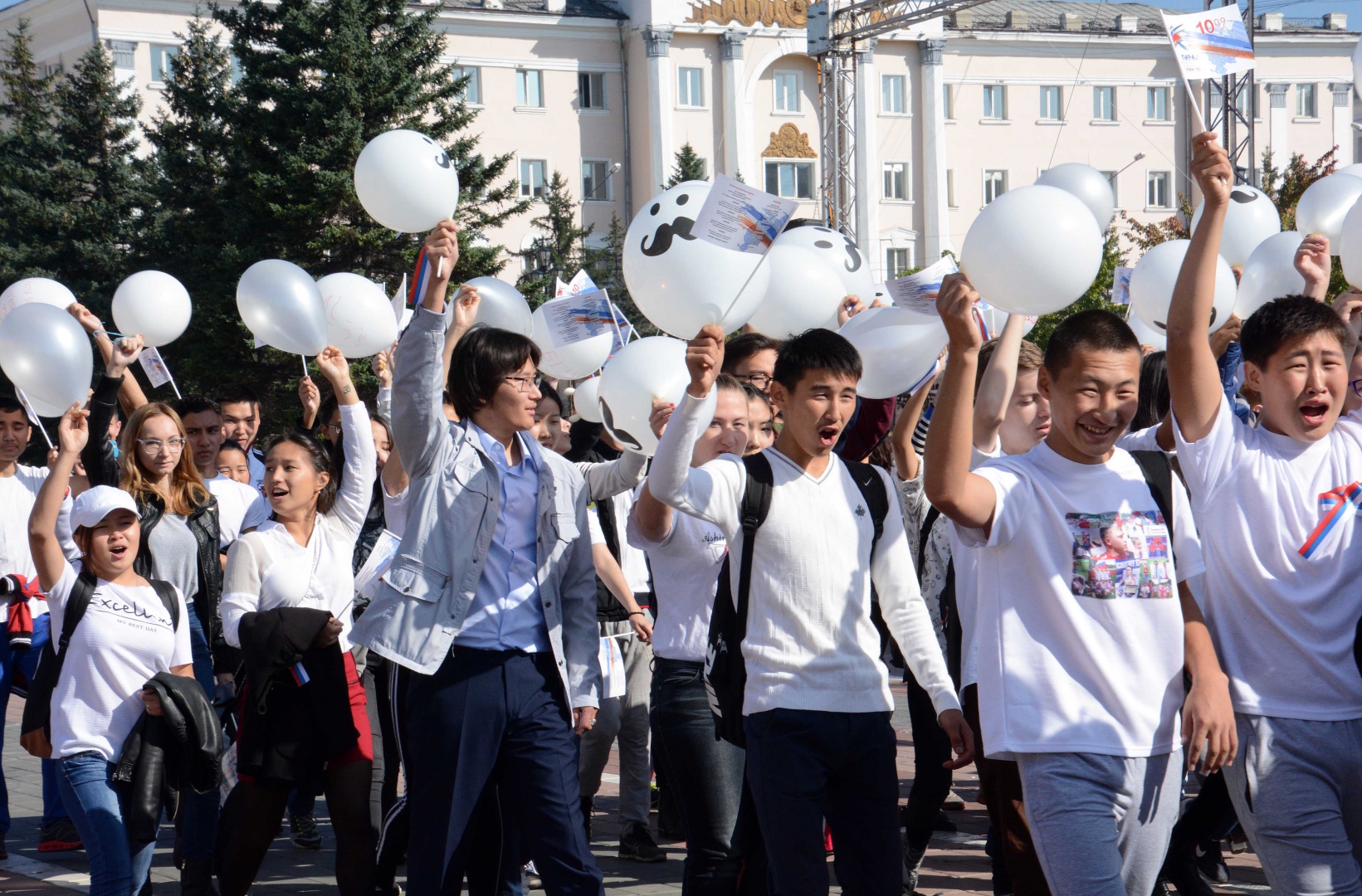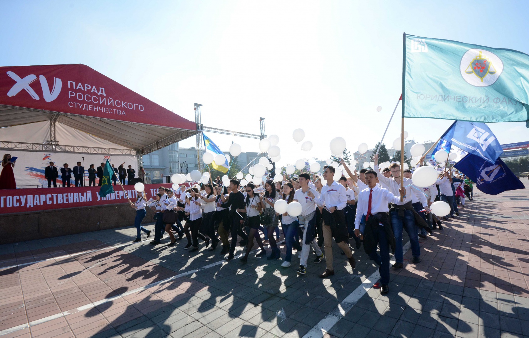 По площади Советов прошло грандиозное шествие 2, 5 тысяч первокурсников бурятских вузов. Возглавили колонну студенты одного из старейших вузов Сибири - нашего Бурятского госуниверситета, за ним также с флагами и нарядными воздушными шарами торжественно прошли колонны студентов ВСГУТУ, ВСГИК, БГСХА, Бурятского филиала СибГУТИ, Улан-Удэнского института железнодорожного транспорта. Прошла перекличка участников парада, в которой студенты проскандировали лозунги и девизы своих вузов. Праздничную атмосферу действия поддержало яркое дефиле барабанщиц.