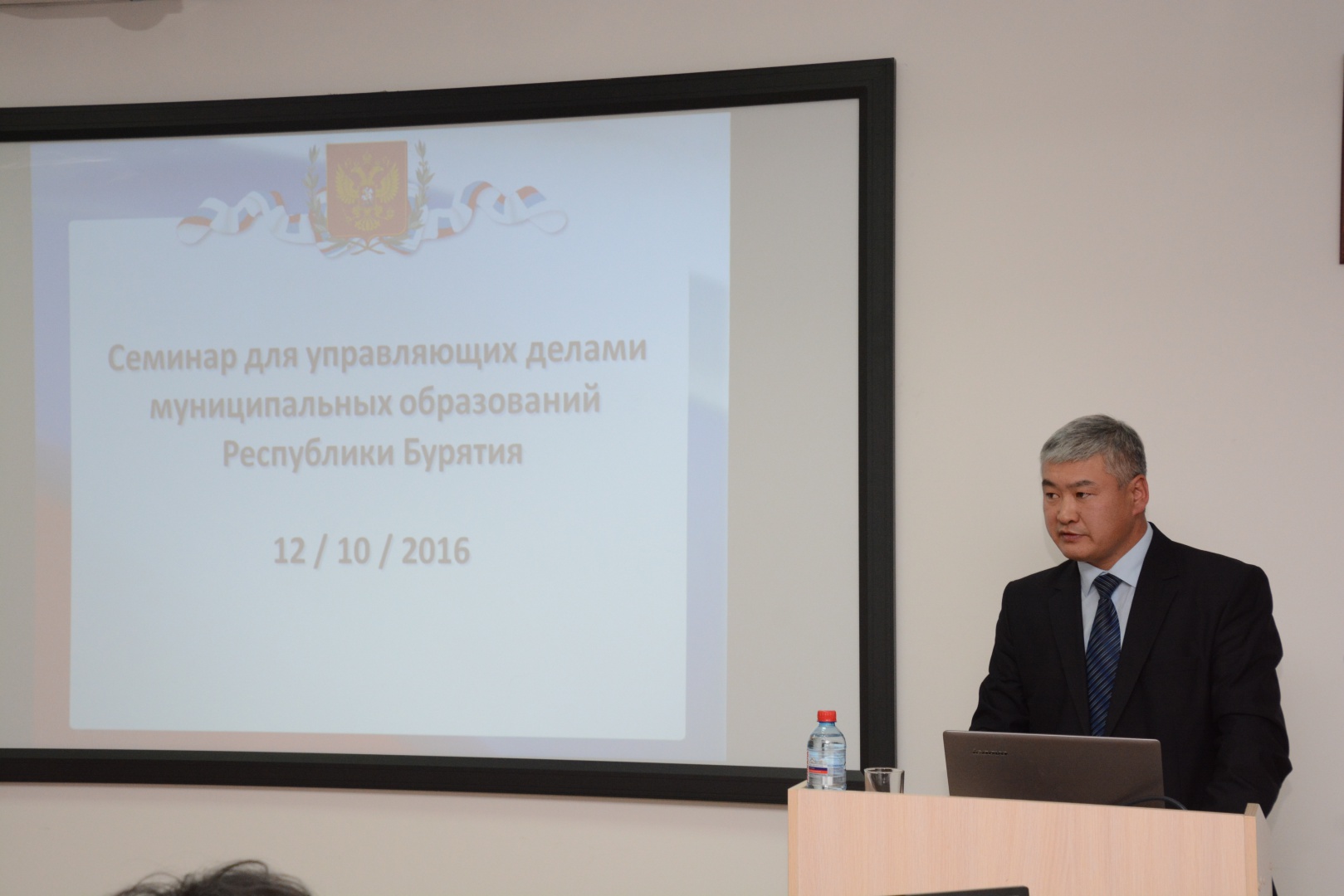 В конференц-зале Научной библиотеки БГУ прошла 1 часть семинара, с докладами выступили Заместитель председателя Комитета территориального развития АГРБиПРБ Л. Н. Мотошкин, зав.кафедрой экономической теории, государственного и муниципального управления А. А. Дугарова, научный руководитель ИЭУ профессор Н. И. Атанов и другие специалисты из Правительства Бурятии и преподаватели Института экономики и управления БГУ.