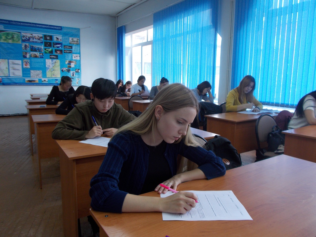 Факультет биологии, географии и землепользования активно подключился к этой акции. Очень радует, что в субботний день, студенты проявили сознательность и высокую активность. Всего было 68 участников (58- ФБГиЗ, ПИ – 9, ВИ- 1). В начале мероприятия активный член БРО РГО Тумуреева Наталья Николаевна кратко рассказала о деятельности общественной организации, о проектах, конкурсах и грантах, руководстве и перспективах развития. Затем участникам был предложен текст диктанта, который состоял из 25 пунктов и включал в себя задания на знание экологических понятий, терминов, законов, расположение особо охраняемых территорий Байкальского региона (ООПТ), задания на логику и размышления. На выполнение заданий отводилось 80 минут. Было запрещено пользоваться любыми источниками, за чем пристально следили преподаватели ФБГиЗ (зам. декана по УР, канд.биол.наук, доцент Т.Г. Басхаева, зам.декана по ВР, канд.геогр.наук, доцент Е.Э. Валова, канд.биол.наук, доцент С.А. Холбоева, канд.биол.наук, доцент Е.М. Пыжикова). Результаты участникам будут объявлены после 27 октября. Но следует отметить, что трудность вызвали многие вопросы.