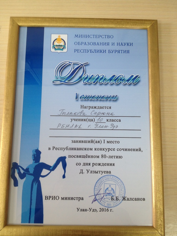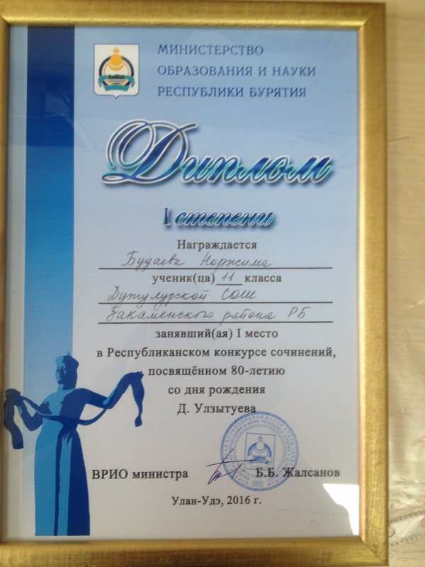 Лучшее сочинение на бурятском языке – Цыцыкова Юлия Владимировна, 10 кл., Улюнская СОШ, Баргузинский район