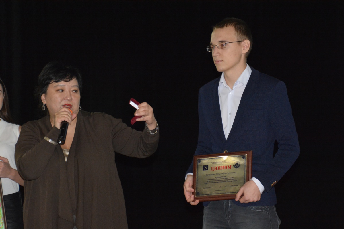 Все гости с нетерпением желали узнать, кто же удостоился этого почетного звания, и наконец этот момент настал. Лучшим студентом 2016 года стал Александр Кутумов, студент 3 курса гр. 11440.Отличник учебы. Куратор группы первокурсников. Член Всероссийского общественного движения «Волонтеры Победы». Волонтер «Добровольческого центра Республики Бурятия». Вновь избранный председатель Студенческого научного общества БГУ. Автор научных статей, опубликованных в международных изданиях. Победитель олимпиад регионального и межрегионального уровней в составе команды института. Участник команды «Эрудитов», в составе которой не раз приносил победу Институту. Участник Всероссийского форума добровольцев «Сообщество». Тренер и организатор Республиканских школ волонтера. Тренер направления «Добровольчество» Байкальского молодежного форума «Будущее за нами – Курс на будущее! - 2016». Организатор многочисленных мероприятий регионального и федерального масштаба в сфере добровольчества таких, как всероссийские исторические молодежные квесты, Национальный праздник Сагаалган и фестиваль «Энергия движения». Организатор международной экономической летней школы «Старт в бизнес». Член сборных института по различным видам спорта, в составе которых не раз приносил ему призовые места. Директор института Е.Н. Ванчикова вручила ему нагрудной знак из чистого золота с гравировкой "Лучший студент 2016".