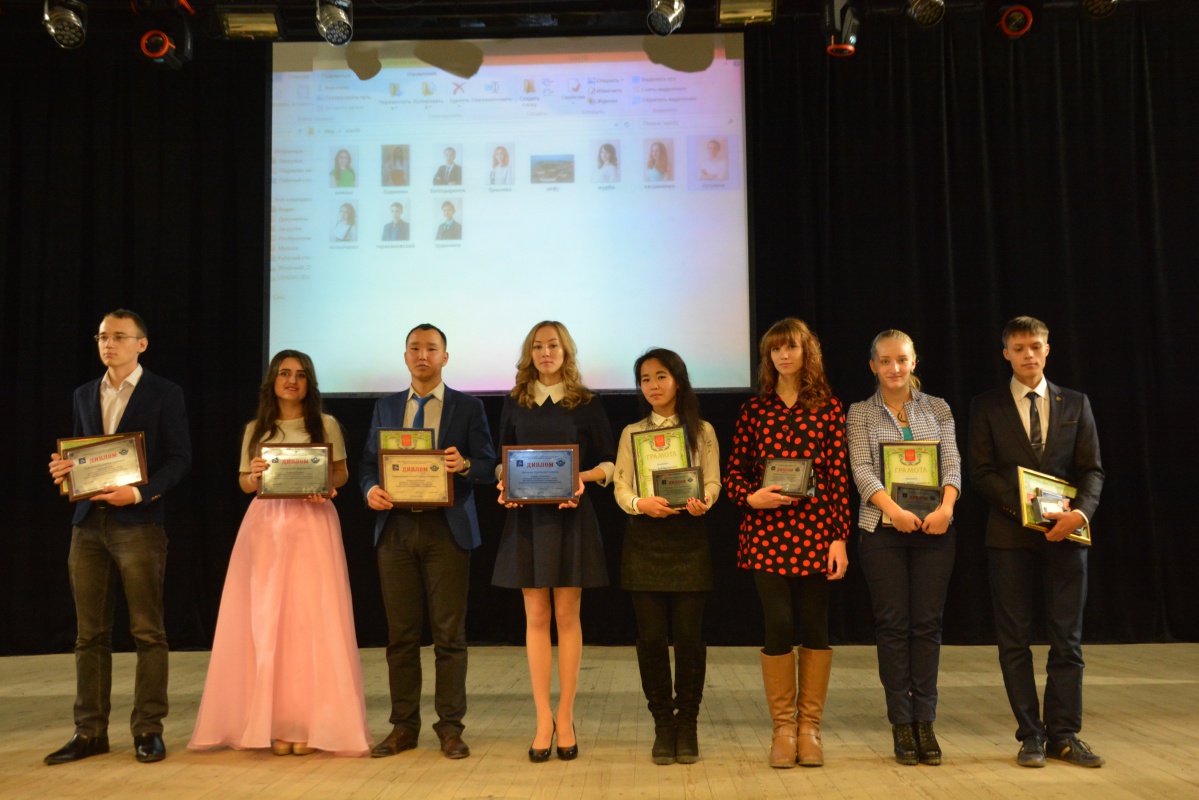 Лауреатом 1 степени стала студентка 4 курса гр. 11530п. - Аида Алиева, лауреаты 2 степени - Агван Батоцыренов, студент 4 курса гр. 11430 и Кристина Брылева, студентка 3 курса гр. 11240, лауреат 3 степени - Жаргал Эрдыниев, студент 4 курса, гр. 11130. Номинации "Волонтер года" был удостоен Андрей Таракановский, "Универсал года" - Анастасия Журба, "Общественный деятель" - Алина Бадмаева, в номинации "Персона науки" победила Валерия Полынцева и номинацию "Муза года" получила Татьяна Касьяненко.
