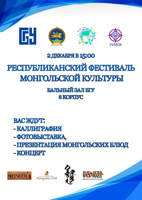 Приглашаем Всех посетить Фестиваль монгольской культуры, который состоится 2 декабря в 15.00 и 16.00, в бальном зале, 6 этаж, корпус №8!