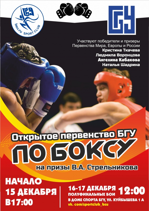 15-17 декабря в Доме спорта БГУ (по адресу ул. Куйбышева 1а) пройдет открытое первенство БГУ по боксу на призы чемпиона СССР, мастера спорта международного класса, доктора педагогических наук, профессора Стрельникова Валерия Александровича