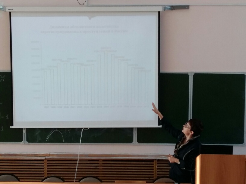 Тема данной лекции была посвящена характеристикам современной преступности в Российской Федерации. Известный в России и за рубежом криминолог рассказала будущим юристам об основных особенностях преступности и её динамике, о проблеме статистического учета преступлений, в частности, убийств, и их раскрываемости. Особенное внимание Анна Леонидовна уделила региональным особенностям на примере Иркутской области, Республики Бурятия и Забайкальского края.