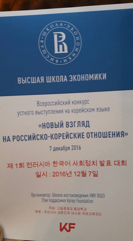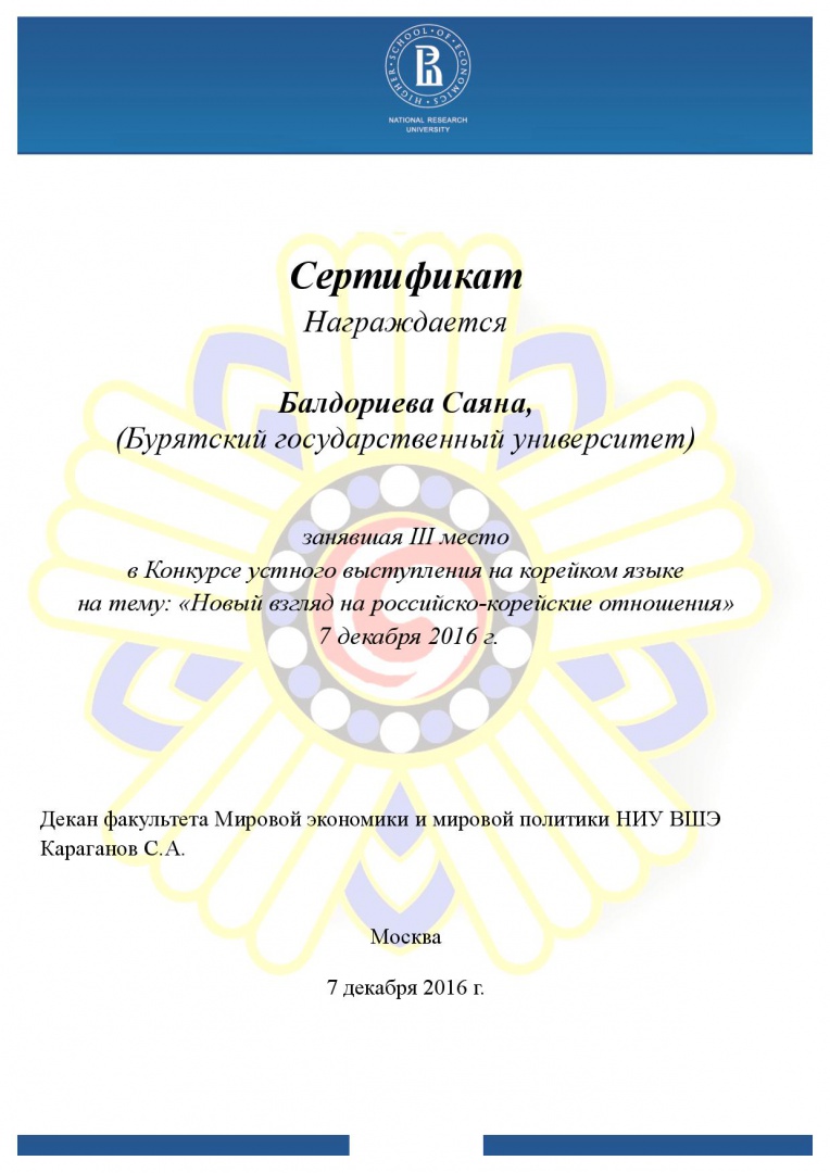 7 декабря студентка Восточного института БГУ Саяна Балдориева заняла III место во всероссийском конкурсе устных выступлений на корейском языке: «Новый взгляд на российско-корейские отношения». Конкурс был организован при поддержке Корейского фонда на факультете мировой экономики и мировой политики Национального исследовательского университета «Высшая школа экономики» (г. Москва).