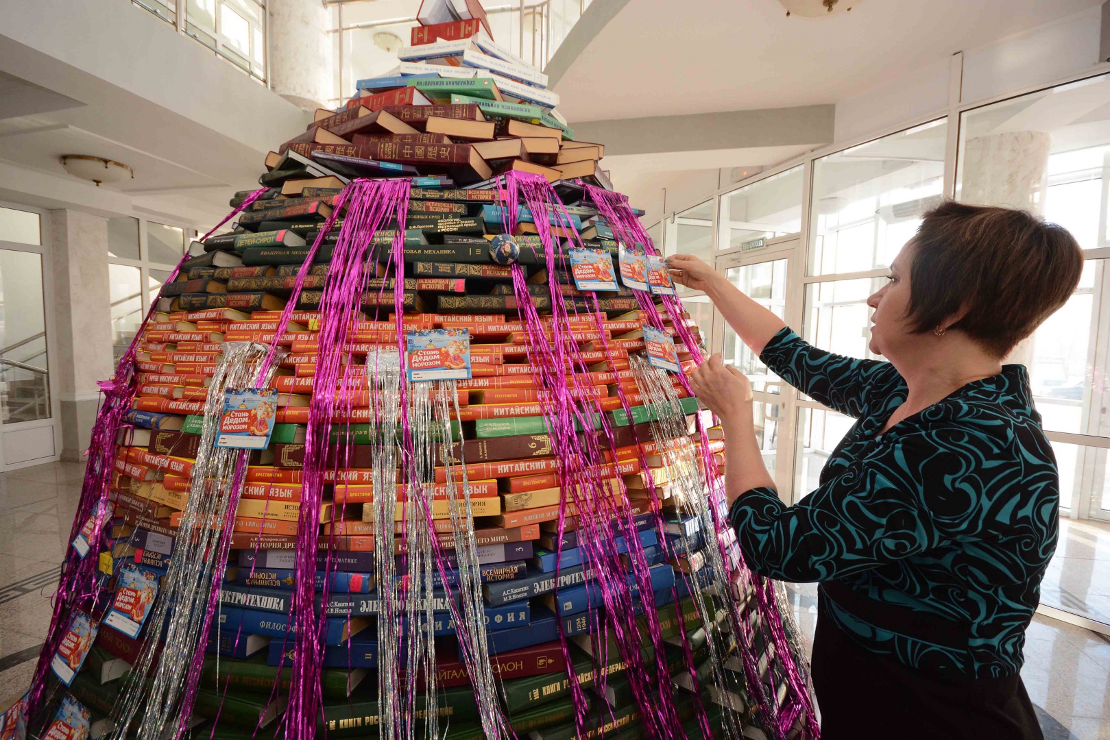 Министерство соцзащиты передало Научной библиотеке БГУ список 283 воспитанников из шести детских домов республики. Карточки с именами детей развешаны на ёлке, которую сотрудники библиотеки выстроили из книг и украсили в фойе 8 корпуса. Теперь у студентов, преподавателей и сотрудников университета есть возможность подарить радость в канун нового года любому из этих детей. Каждый желающий может стать хотя бы на минуту настоящим Дедом Морозом для конкретного ребенка, так нуждающегося в праздничные дни в заботе и участии, положив подарок под книжную ёлку.