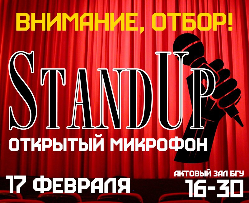 17 февраля в 16:30 в актовом зале главного корпуса Бурятского государственного университета, пройдет отбор в молодежное творческое направление - Stand Up. Stand Up - это комедийное представление разговорного жанра, в котором, как правило один исполнитель выступает перед живой аудиторией. Уважаемые студенты Бурятского государственного университета, мы ждем всех желающих в назначенное время, в назначенном месте!