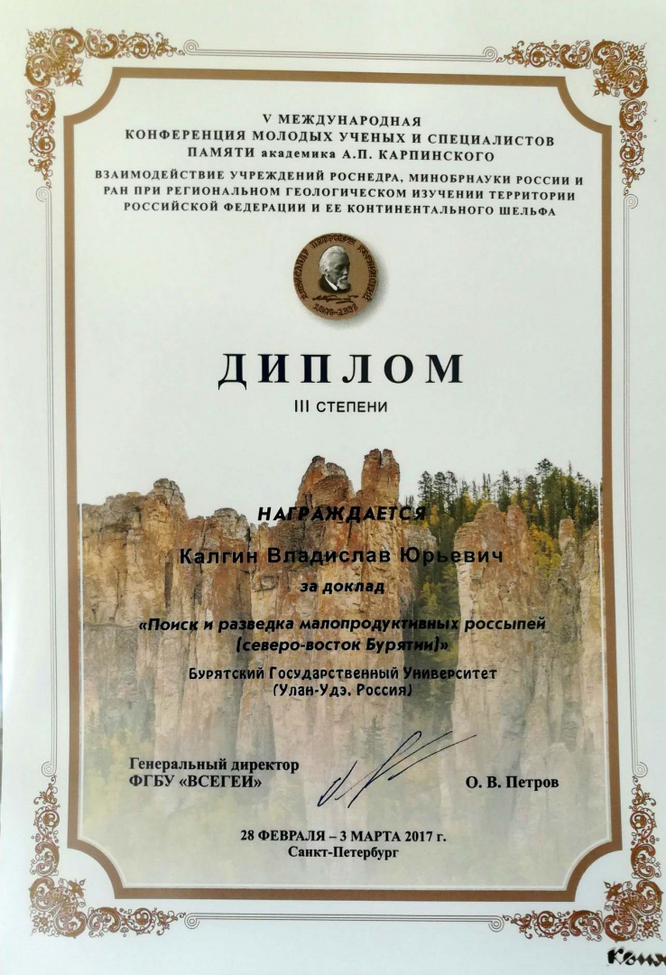 Студенты химического факультета представили на конференции свои работы в области изучения недр, четвертичной геологии и стратиграфии, а также результаты исследования загрязнения почв в районах добычи минеральных ресурсов в Бурятии. По итогам конкурсной части конференции студенту 4 курса Калгину Владиславу был вручен диплом III степени за доклад «Поиск и разведка малопродуктивных золотоносных россыпей (Северо-восток Бурятии)», а студенту 4 курса Скрипникову Михаилу диплом I степени за доклад «Стратиграфия и корреляция нижнекембрийских отложений Саяно-Байкальской области и Монголии по археоциатам».