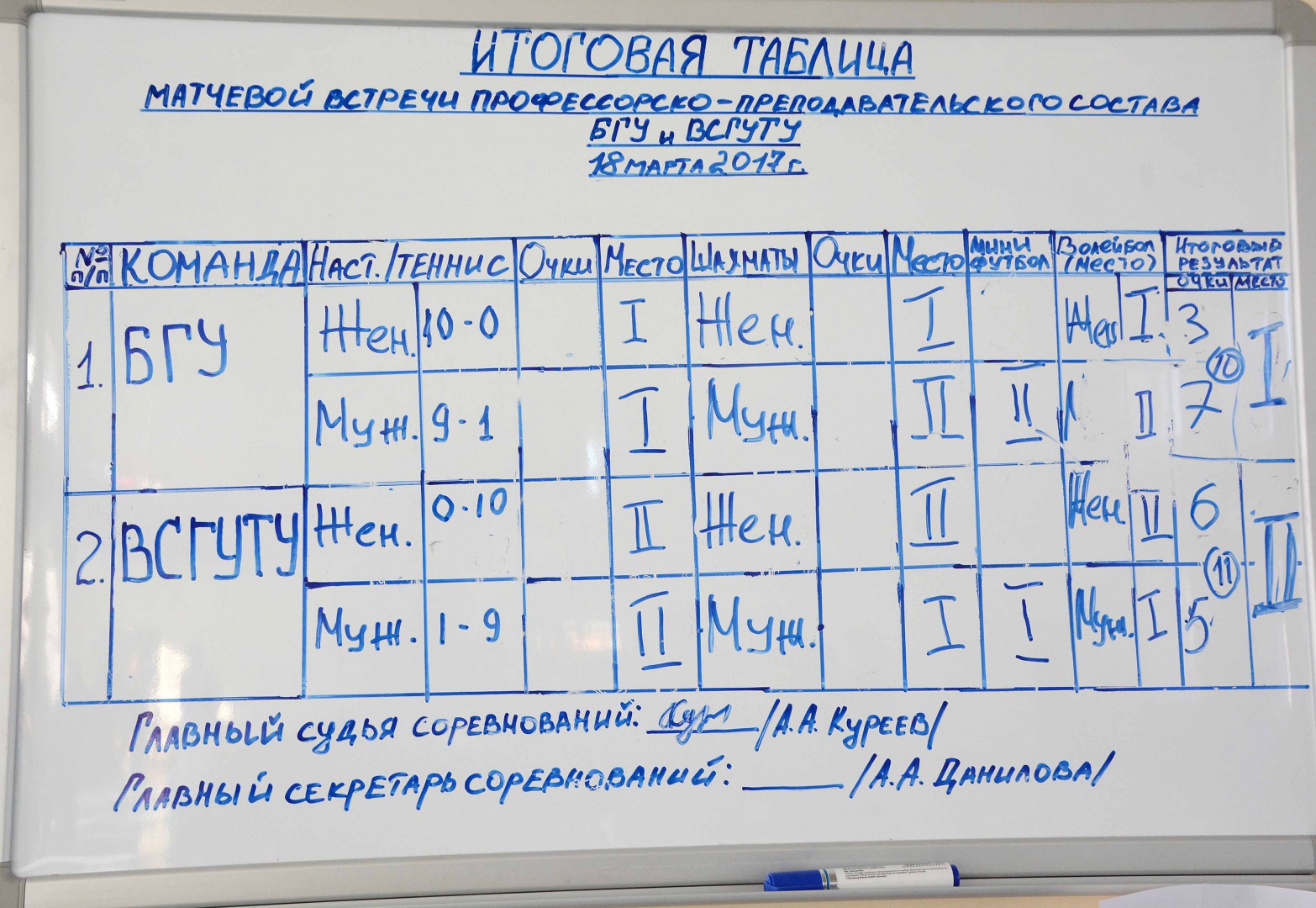 На этот раз на спортивных площадках встретились преподаватели двух ведущих вузов республики – БГУ и ВСГУТУ. Несмотря на то, что четыре спортивных вида (настольный теннис, шахматы, волейбол и футбол) уместились в один соревновательный день, состязания получились захватывающими, зрелищными, интересными самим участникам и их болельщикам. И хотя многим участникам был по душе известный олимпийский лозунг – «Главное не победа, а участие!», все верили в победу, а в ходе борьбы это чувство только нарастало.