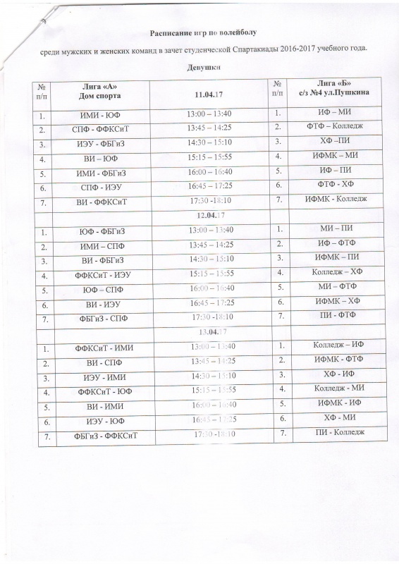 Девушки - 11-13 апреля (Лига "А", дом спорта), (Лига "Б", спорт зал №4 ул.Пушкина).