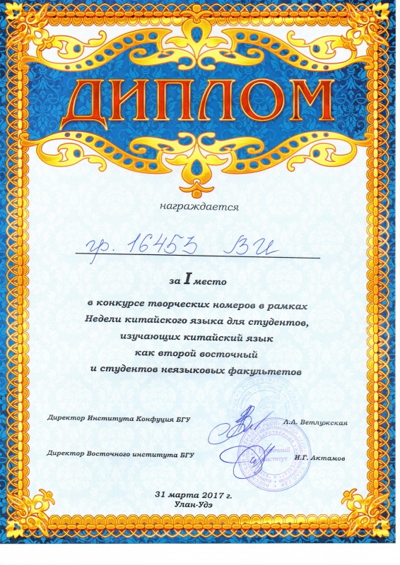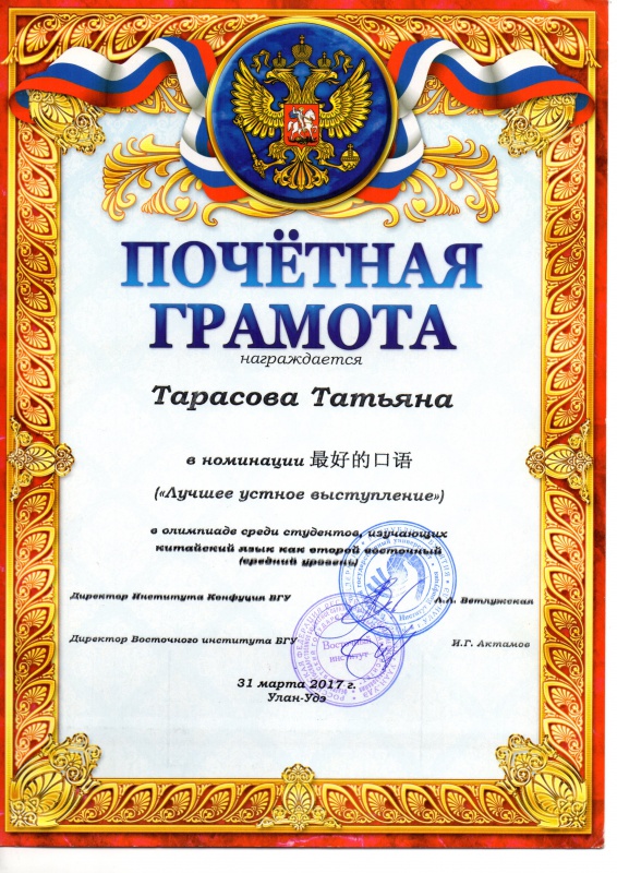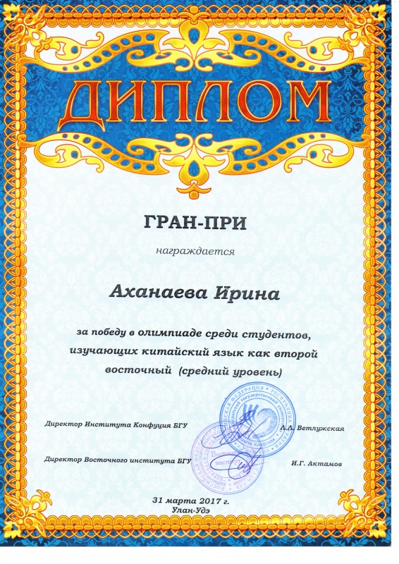 Обладатель Гран-при Аханаева Ирина получила также сертификат на бесплатную поездку в Китай - Летний лагерь Института Конфуция-2017.
