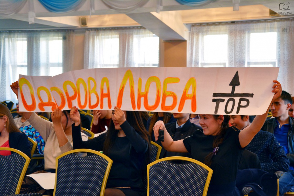 На сцене собрались студенческие профсоюзные лидеры – председатели и заместители профбюро, руководители проектов : Одорова Любовь (ПИ), Филь Анастасия (ИЭУ), Эрдынеева Дулма (Колледж), Усикова Анна (ИФ), Сечина Виктория (ЮФ), Цыренов Булат (ИЭУ), Норбоева Бэлигма (ХФ).