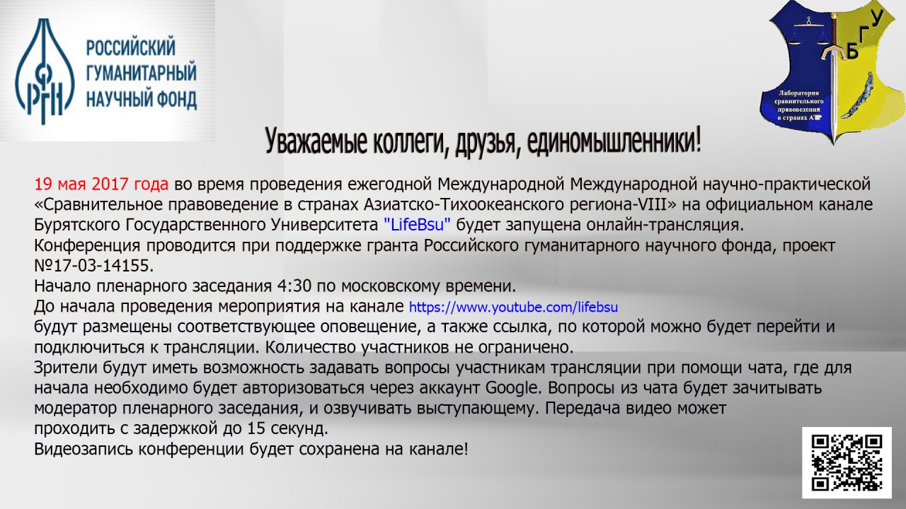 19 мая 2017 года во время проведения ежегодной Международной научно-практической конференции «Сравнительное правоведение в странах Азиатско-Тихоокеанского региона-VIII» на официальном канале Бурятского Государственного Университета "LifeBsu" будет запущена онлайн-трансляция.