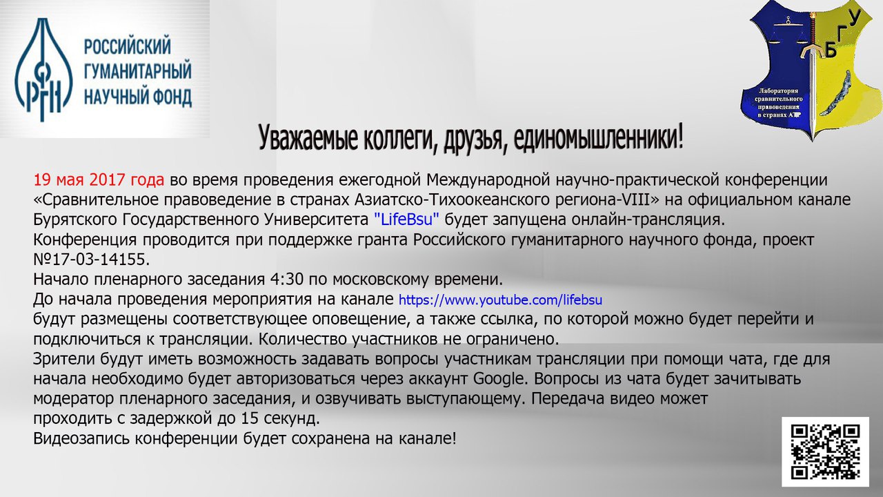 Во время проведения конференции на официальном канале Бурятского Государственного Университета "LifeBsu" будет запущена онлайн-трансляция, где до начала мероприятия будут размещены соответствующее оповещение и ссылка, по которой Вы сможете перейти и подключиться к данной трансляции.