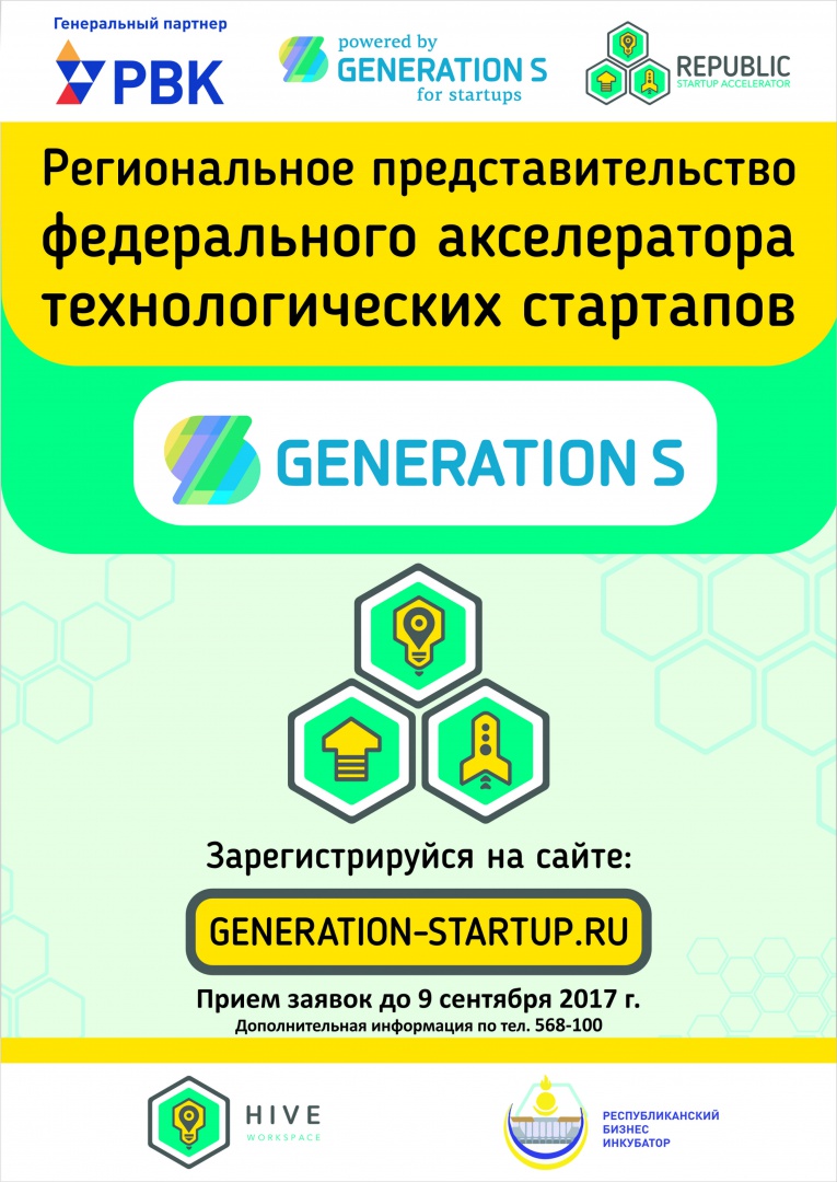 В июле 2017 г. у предпринимателей, занимающихся технологическими разработками, появилась возможность принять участие в региональном этапе конкурса «GenerationS». Данная программа реализуется в Бурятии на базе акселерационной программе «Республика». Целью мероприятия является содействие ускоренному развитию инновационных технологических проектов и обучение основам технологического предпринимательства.