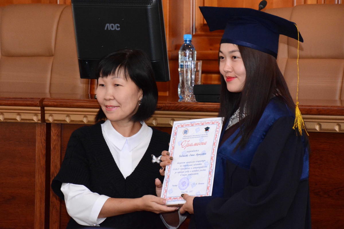 Со словами поздравлений выступила начальник научно-исследовательской части кандидат социологических наук, доцент Доржиева И.Ц., она вручила Почётные грамоты и памятные подарки выпускникам аспирантуры.