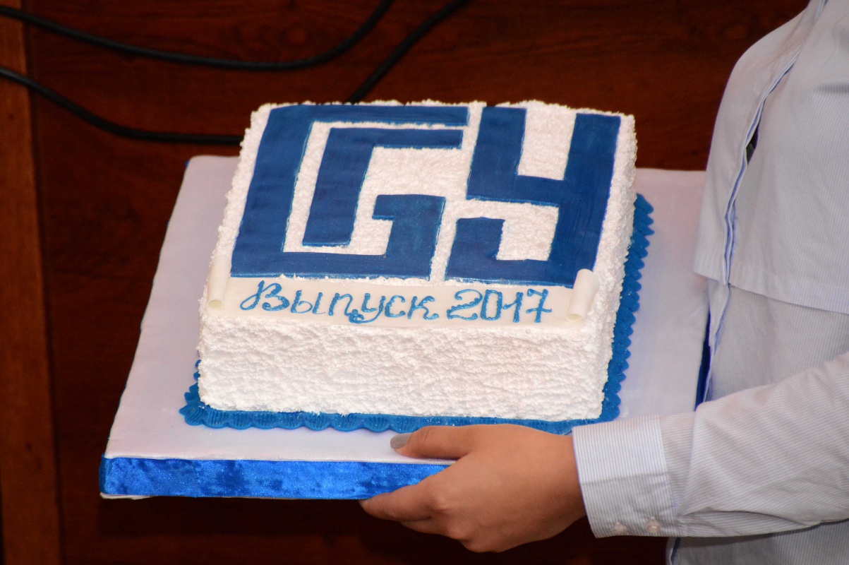 На торжественной церемонии также прозвучали поздравления от Первичной профсоюзной организации студентов и аспирантов в лице председателя Юлии Наквасиной. Подарком выпускникам стал большой праздничный торт с логотипом БГУ.